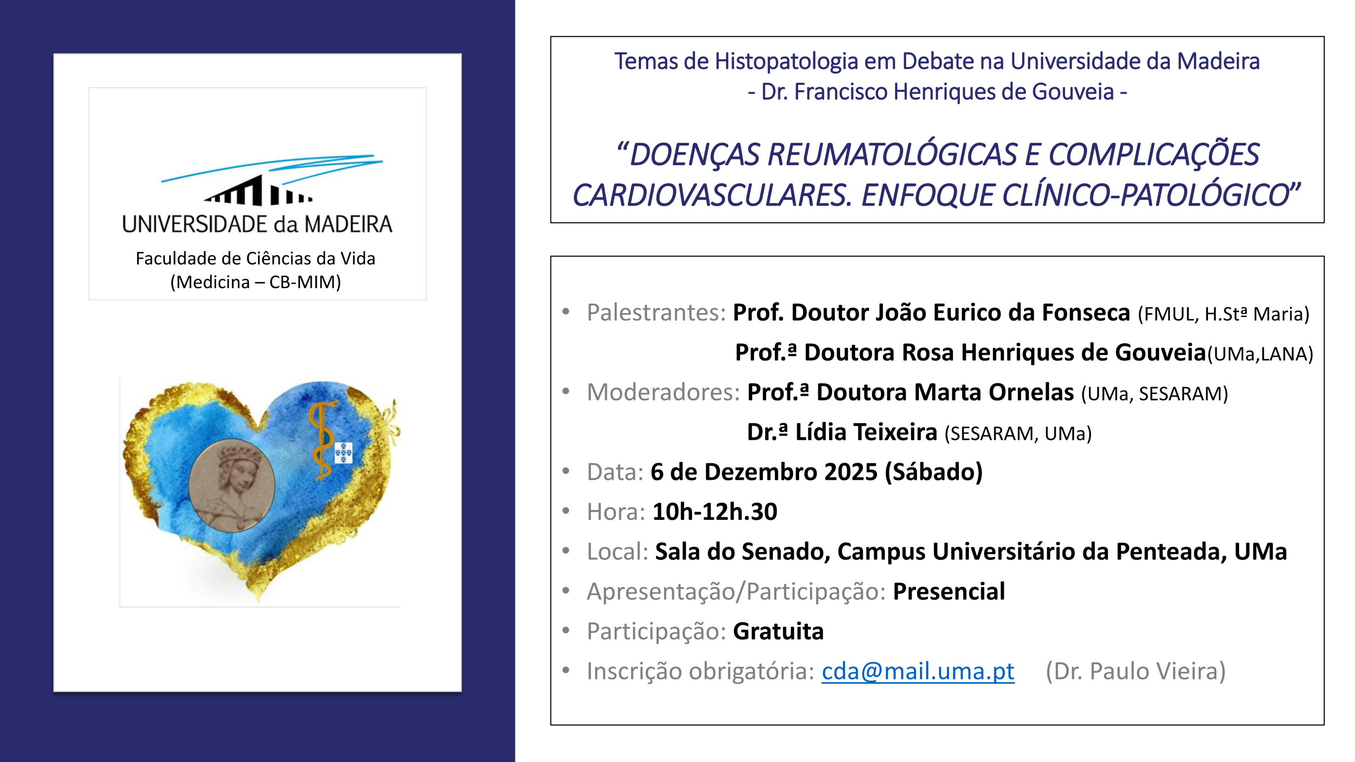 A sessão, organizada pela Faculdade de Ciências da Vida da Universidade da Madeira, no âmbito do Ciclo Básico do Mestrado Integrado em Medicina, decorrerá entre as 10h00 às 12h30, na Sala do Senado, no Piso – 2 do Campus Universitário da Penteada, e será dedicada ao tema “Doenças Reumatológicas e complicações cardiovasculares. Enfoque Clínico-Patológico”.