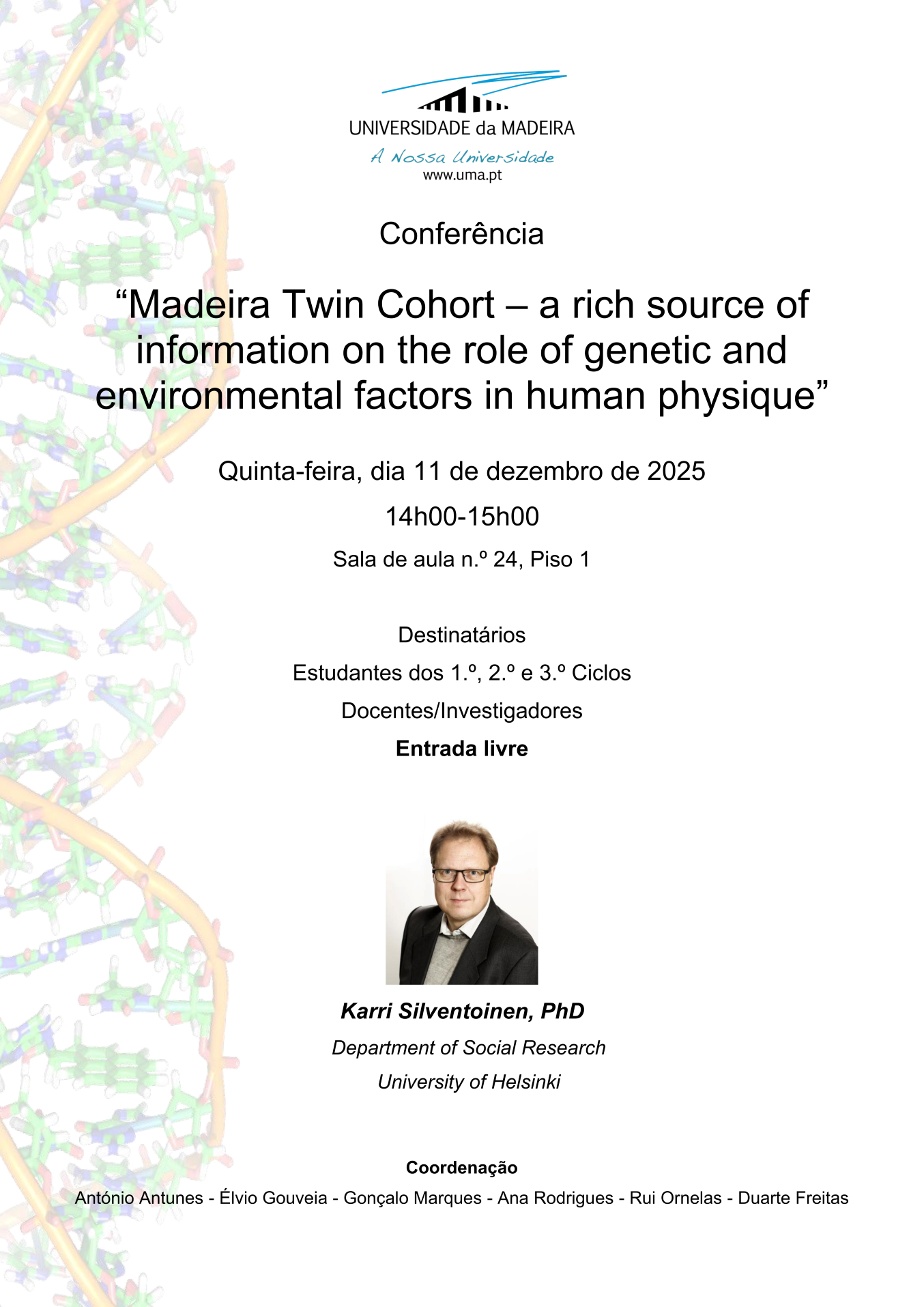 A conferência vai decorrer na Sala 24, no Campus Universitário da Penteada, das 14h00 às 15h00, e será proferida por Karri Silventoinen (Department of Social Research, University of Helsinki).