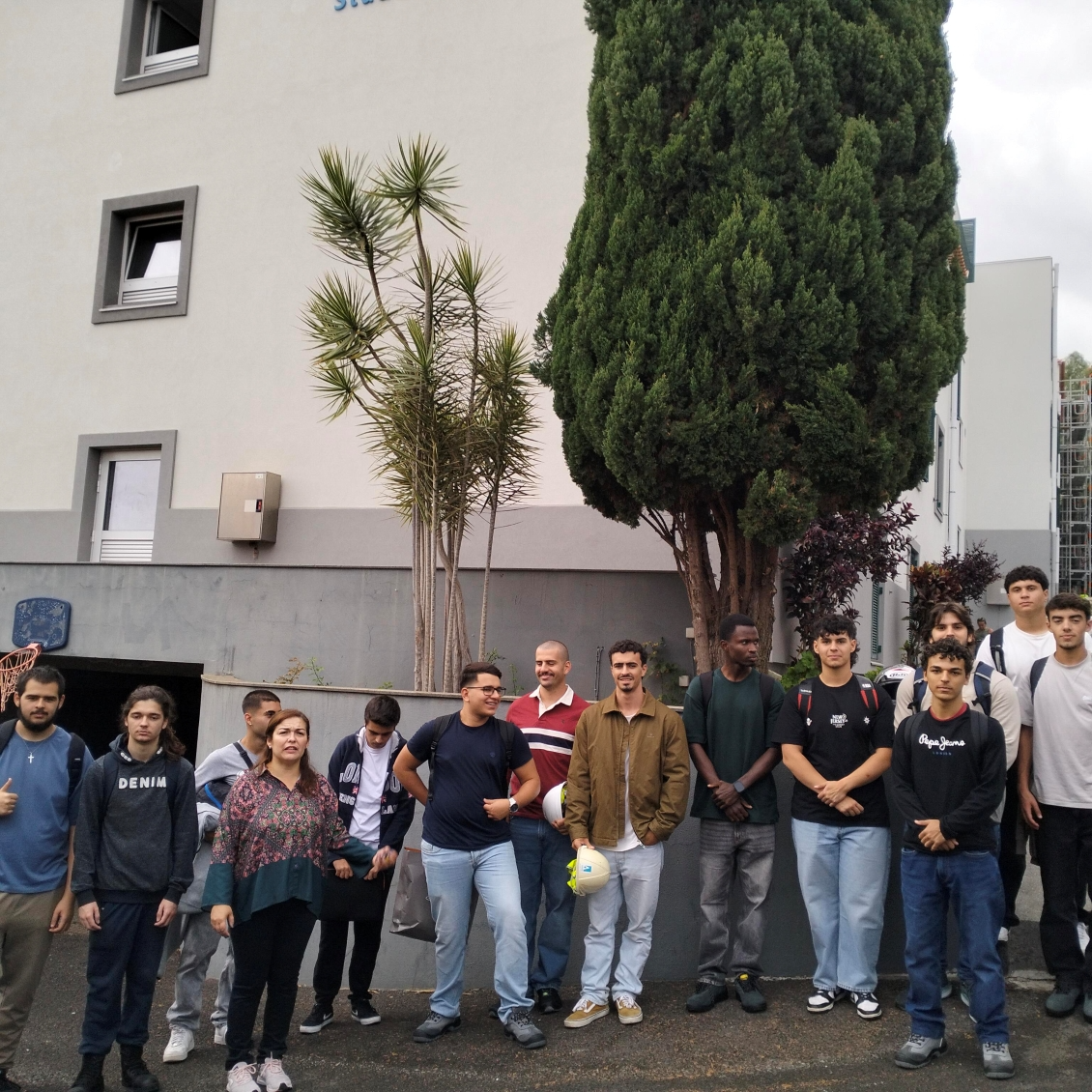 Já no passado dia 9 de outubro, o mesmo grupo de alunos, acompanhados da mesma docente visitaram o edifício onde surgirá, uma outra residência universitária, na Rua da Carreira onde estão a ocorrer as obras de reabilitação/requalificação até janeiro de 2026, no antigo edifício onde funcionou o curso de Belas-Artes e Design. Note-se que este edifício do século XVIII (aproximadamente 200 anos de existência) está localizado na Zona Histórica do Funchal e está integrado na Área de Reabilitação Urbana do Centro Histórico da Sé. Como tal, existiram requisitos a respeitar aquando da execução do projeto de reabilitação/requalificação, nomeadamente: manter o aspeto exterior das fachadas da envolvente, manter ao máximo possível as carpintarias existentes nos vão envidraçados e as que não estavam em condições para serem reabilitadas foram replicadas considerando o formato original, assim como os tetos guarnecidos com sancas em gesso que estão a ser alvo de restauro e a famosa calçada madeirense presente e preservada no pátio que dá acesso à futura zona de convívio. A futura residência universitária será um edifício acessível a alunos com necessidades motoras especiais, pois será munido de um elevador e de uma plataforma elevatória (salvaguardando a diferença de cota existente entre o arruamento exterior e a entrada principal do edifício intervencionado). Na fase de projeto, também foram considerados quer a portaria como o decreto-lei referidos anteriormente. Como tal, no exterior foi aplicada cortiça projetada e interiormente foram colocadas placas de isolamento de lã de rocha entre as placas de gesso cartonado hidrófugo ou entre as placas de gesso resistentes ao fogo também instaladas. A estrutura de suporte da cobertura foi literalmente renovada, estrutura em pedra foi reforçada com pilares e vigas de aço e inicialmente pretendia-se alcançar uma classe energética mínima de C, mas no final da obra com algumas alterações que foram necessárias fazer, a classe energética após a intervenção poderá chegar a B. Apesar de se terem mantido as portadas em madeira, os vidros dos vãos envidraçados foram substituídos por vidros com espessuras de 6 mm. Mais próximo do final da obra serão instalados painéis fotovoltaicos de forma a tornar o edifício mais autónomo do combustível fóssil e proporcionando mais sustentabilidade, ao mesmo. A futura residência universitária será dotada de 10 estúdios para ocupação dupla e 5 estúdios para ocupação simples/singular.