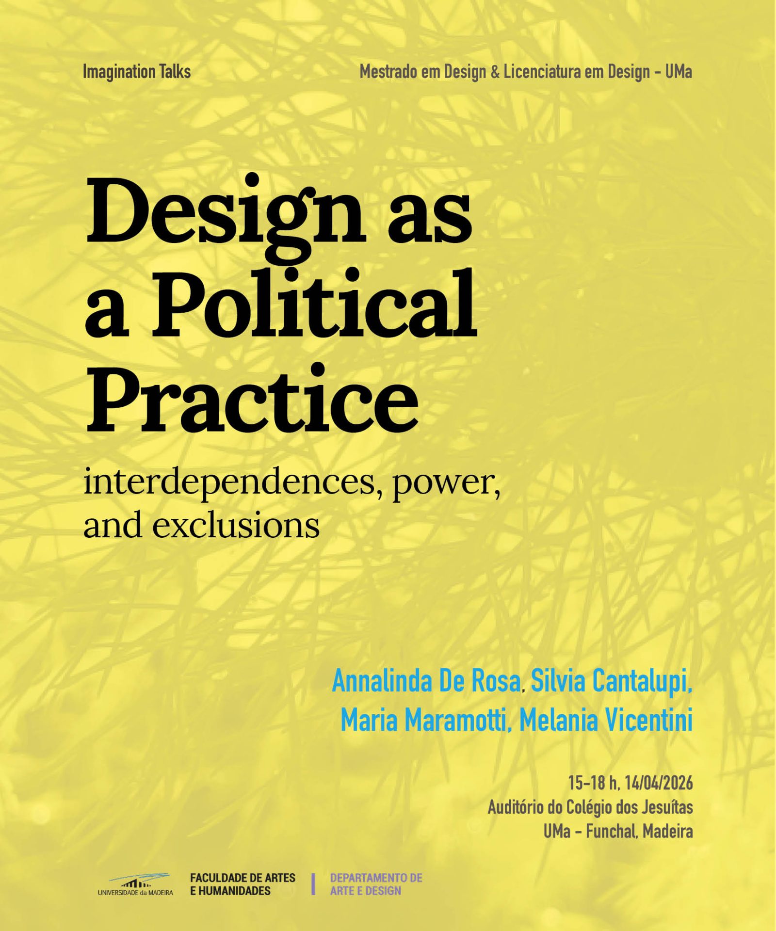 This lecture series brings together four perspectives that critically engage design as a political practice, examining how it participates in shaping relations of power, interdependence, and exclusion across different contexts.