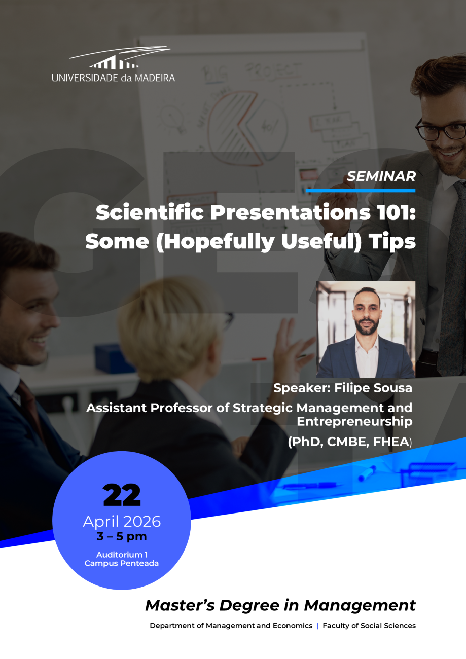 A Direção do Mestrado em Gestão convida todos os alunos do mestrado e restante comunidade académica a participarem no próximo seminário no âmbito do Mestrado em Gestão sobre “Scientific Presentations 101: Some (Hopefully Useful) Tips”, que será proferido pelo Prof. Doutor Filipe Sousa, no dia 22 de abril de 2026, no Anfiteatro 1.