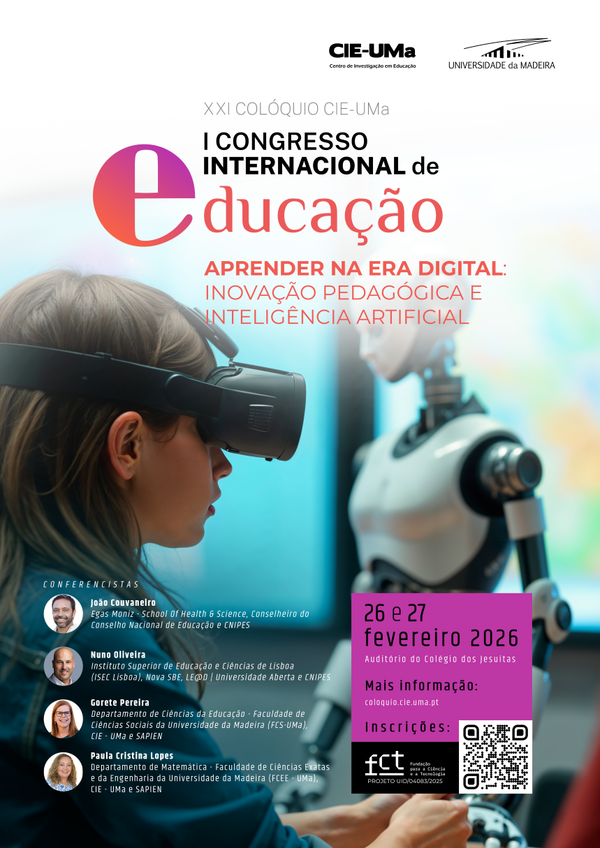 O XXI Colóquio do Centro de Investigação em Educação da Universidade da Madeira (CIE-UMa) realiza-se em conjunto com o I Congresso Internacional de Educação, nos dias 26 e 27 de fevereiro, sob o tema “Aprender na Era Digital: Inovação Pedagógica e Inteligência Artificial”.
