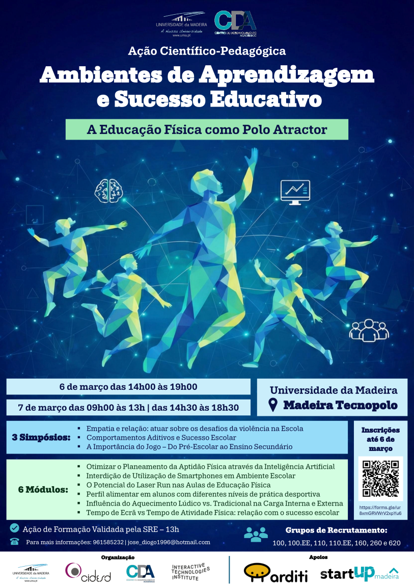 Esta atividade é organizada no âmbito do Mestrado em Ensino de Educação Física nos Ensinos Básico e Secundário da Universidade da Madeira (MEEFEBS) e enquadra-se na formação contínua de educadores e de professores. É organizada em parceria com o CDA/UMa, o Centro de Investigação em Desporto, Saúde e Desenvolvimento Humano (CIDESD) e o Interactive Technologies Institute (ITI -LARSyS)) e conta com o apoio da ARDITI e da STARTUP Madeira.
