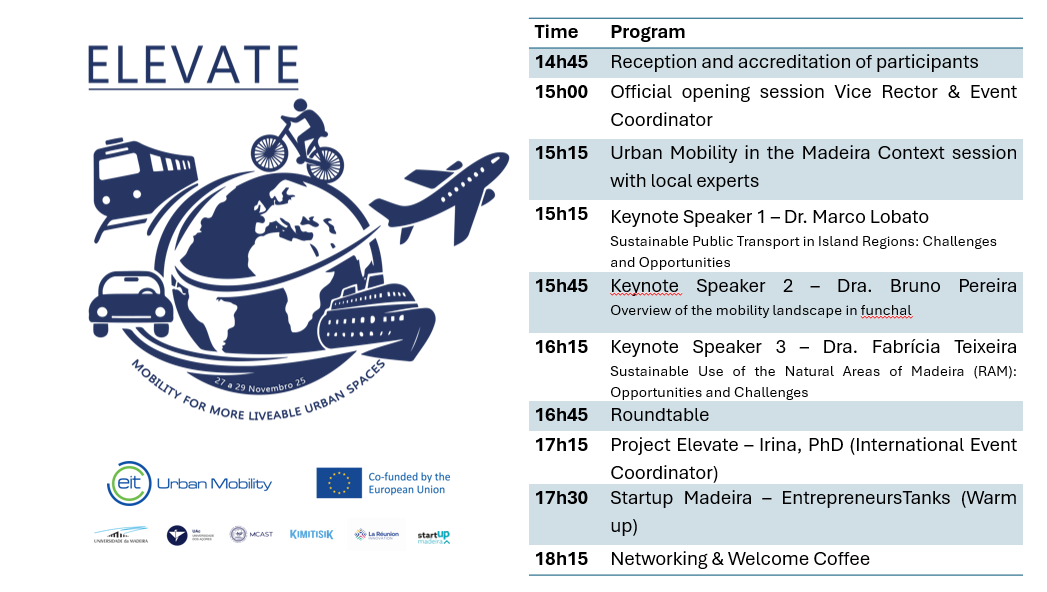 A Universidade da Madeira (UMa) organiza, nos dias 27, 28 e 29 de novembro, o evento internacional ELEVATE, dedicado ao desenvolvimento de soluções inovadoras para a mobilidade urbana sustentável em regiões insulares. A iniciativa é financiada pela EIT Urban Mobility, agência europeia de inovação apoiada pelo Instituto Europeu de Inovação e Tecnologia (EIT).