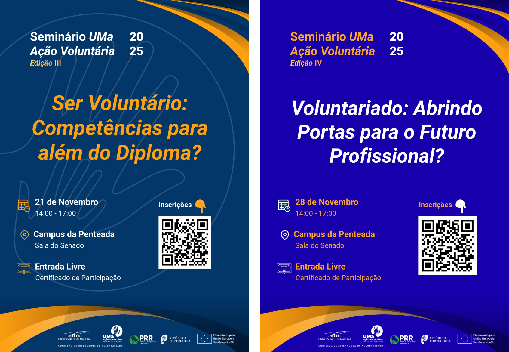 A Comissão Coordenadora de Voluntariado da Universidade da Madeira (CCV) no âmbito das atividades a desenvolver do Projeto “UMa Promoção de Sucesso” irá promover duas novas edições do Seminário “UMa em Ação Voluntária” Edição III e Edição IV, a realizar-se nos dias 21 e 28 de novembro, das 14h00 às 17h00, na sala do Senado, no Campus Universitário da Penteada.
